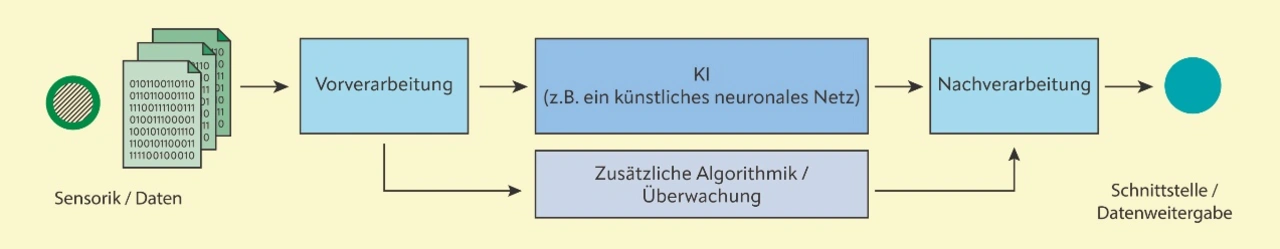Im Zusammenhang mit direkt sicherheitsrelevanten Sensoren wie beispielsweise dem ABS-Drehgeber sind die Sicherheitsanforderungen naturgemäß hoch. Die Antwort hierauf sind sogenannte KI-Hybridsysteme wie in Bild 2 beispielhaft dargestellt. Einerseits erreichen diese eine sehr hohe Robustheit durch das Scoring im Postprocessing; die KI muss also sehr konfident sein. Andererseits werden auch zwecks harter Redundanz herkömmliche Algorithmen parallelgeschaltet. Einfachste Beispiele solcher Funktionen sind die Differenz zwischen Real- und Vorhersagewert oder ein sogenanntes Framing von plausiblen Werten. Bei unplausiblen Ausgaben wird also der KI-Teil überstimmt.