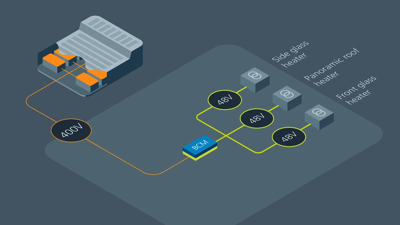 Ein zentraler Bestandteil der Betterfrost-Lösung ist ein auf 48 V ausgelegtes Stromversorgungsnetz. Hierfür werden leistungsstarke, für den Fahrzeugbereich zugelassene 800- und 400-V-zu-48-V-Buswandler mit festem Wandlungsverhältnis verwendet: Die Bus-Converter-Module (BCM) von Vicor liefern effiziente Hochgeschwindigkeitsimpulse an die Glasoberfläche.
