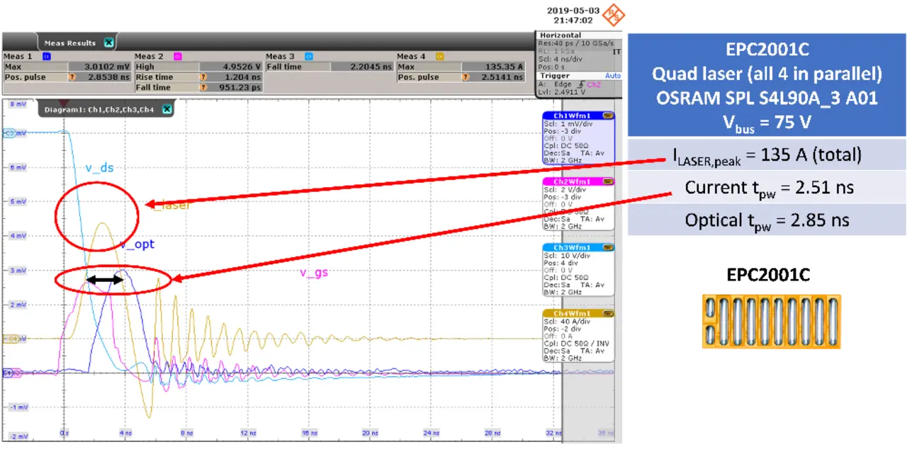 Eine ausreichend große Anzahl von Photonen innerhalb eines sehr schmalen Pulses zu erzeugen kann schwierig sein. Für diese Aufgabe werden vorwiegend seitlich emittierende Laser auf GaN-Basis sowie Transistoren und ICs auf GaN-Basis verwendet, da diese die Anforderungen an sehr hohe Geschwindigkeit und hohe Strombelastbarkeit [3] erfüllen. Bild 5 zeigt ein entsprechendes Oszillogramm, welches einen 135-A-Puls mit einer Pulsbreite von nur 2,51 ns zeigt, der durch den referenzierten GaN-Transistor mit einer Größe von nur 7 mm² erzeugt wird.