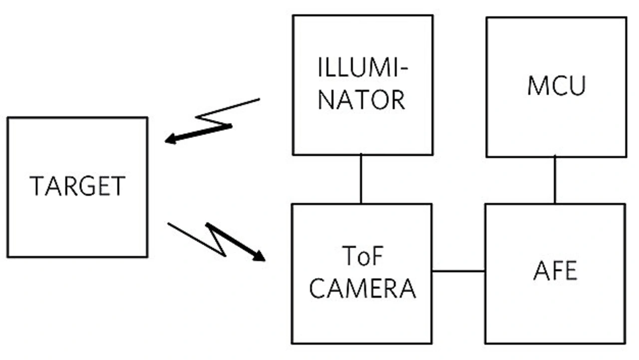 Bild 1 zeigt eine Standardtechnologie, die basierend auf einer ToF-Kamera (Time of Flight) eine dreidimensionale Szene erkennt und abscannt. Die ToF-Technik besteht darin, einen Infrarotstrahl auf ein zu analysierendes Ziel zu senden.