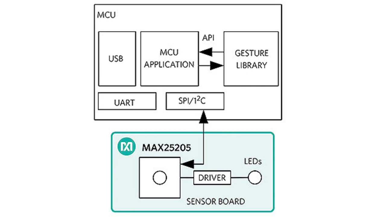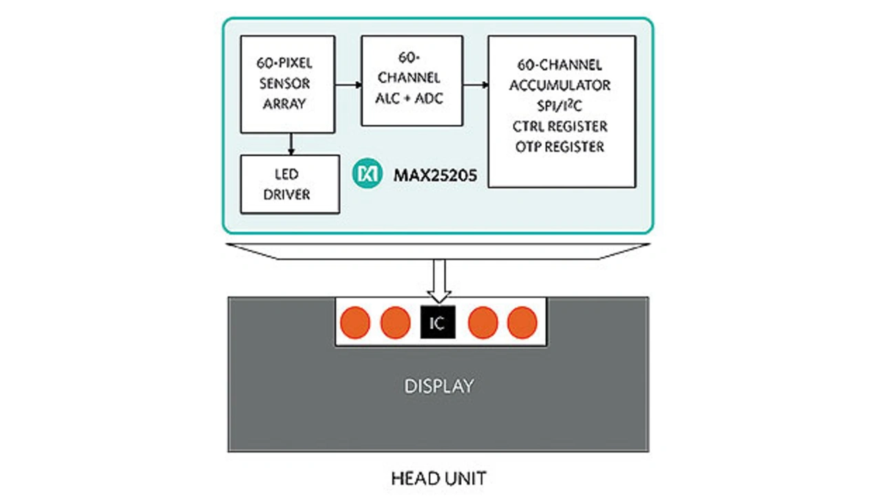 Die Vorteile der Infotainment-Gestensteuerung sind so groß, dass sich jede Anstrengung lohnt, die Komplexität und Kosten zu reduzieren und eine einfache, aber wirkungsvolle Gestensteuerung für eine breitere Nutzung bereitzustellen, wie den neuartigen Fotodioden-Array-ASIC MAX25205 von Analog Devices: Er integriert eine Optik, ein Fotodetektor-Array und ein analoges Frontend (Bild 2).