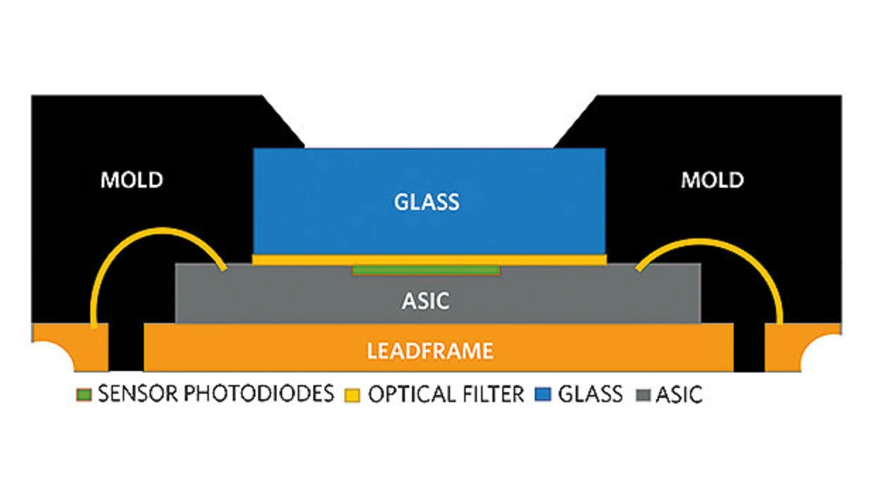 Der integrierte Gestensensor wird für den Erkennungsprozess über SPI oder I2C-Bus mit einer einfachen MCU verbunden. Ermöglicht wird die Integration durch ein proprietäres optisches QFN-Gehäuse mit einer Größe von nur 4 mm x 4 mm. Bild 3 zeigt das gesamte System, einschließlich der Sensor-Photodioden auf dem ASIC zusammen mit dem optischen Filter.