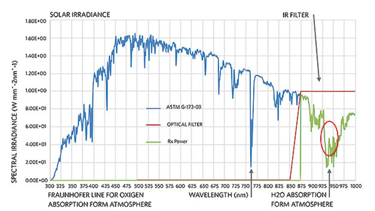 Die Sensoranordnung muss vor Sonneneinstrahlung geschützt werden. Bei 940 nm gibt es einen Einbruch der Sonneneinstrahlung aufgrund der H2O-Absorption in der Atmosphäre. In diesem Bereich arbeitet der Sensor. Ein optischer Hochpassfilter unterdrückt die gesamte Sonneneinstrahlung unter 875 nm (Bild 4).