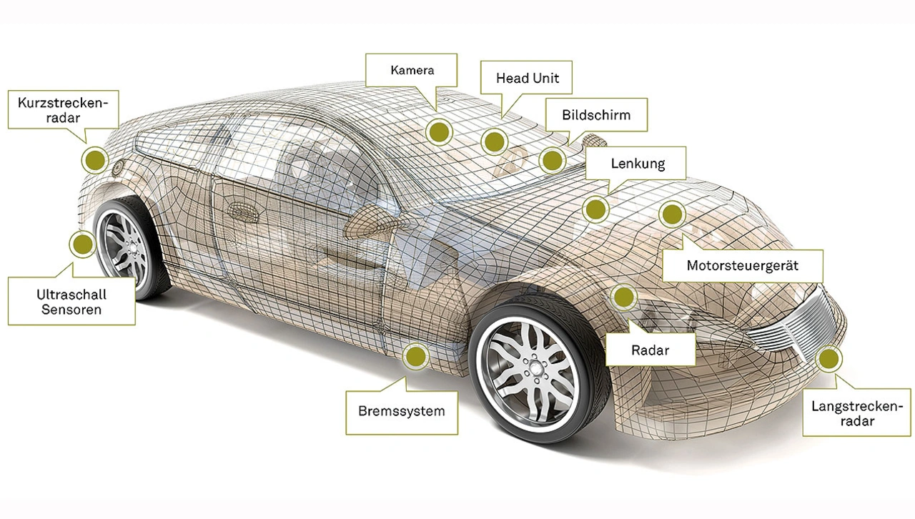 Am vorangehend beschriebenen Beispiel der Absicherung des Autobahnpiloten erklärt, sorgen die Kommunikationsleitungen dafür, dass das von rechts langsamer einscherende Fahrzeug durch die Fahrzeugumfeldsensorik erkannt, die Information unmittelbar an das entsprechende Steuergerät übermittelt und von dort aus das Signal an das Bremssystem geschickt wird.