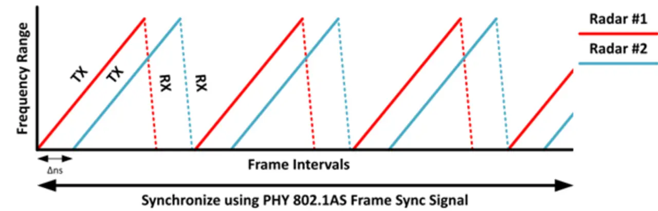 Erfolgt die hardwaremäßige Synchronisation der Frames auf dem Physical Layer (PHY) des TCP/IP-Protokollstapels (Transmission Control Protocol/Internet Protocol), lassen sich die Nachbearbeitungs-Anforderungen an den zentralen ADAS-Mikrocontroller erheblich reduzieren. Binnen Nanosekunden kann der Ethernet-PHY-Transceiver DP83TC817S-Q1 von TI Radar-Frames von zwei oder mehr Radarsystemen auf der Hardware-Ebene sowohl im Zeit- als auch im Frequenzbereich synchronisieren. Bild 2 verdeutlicht dieses Konzept.