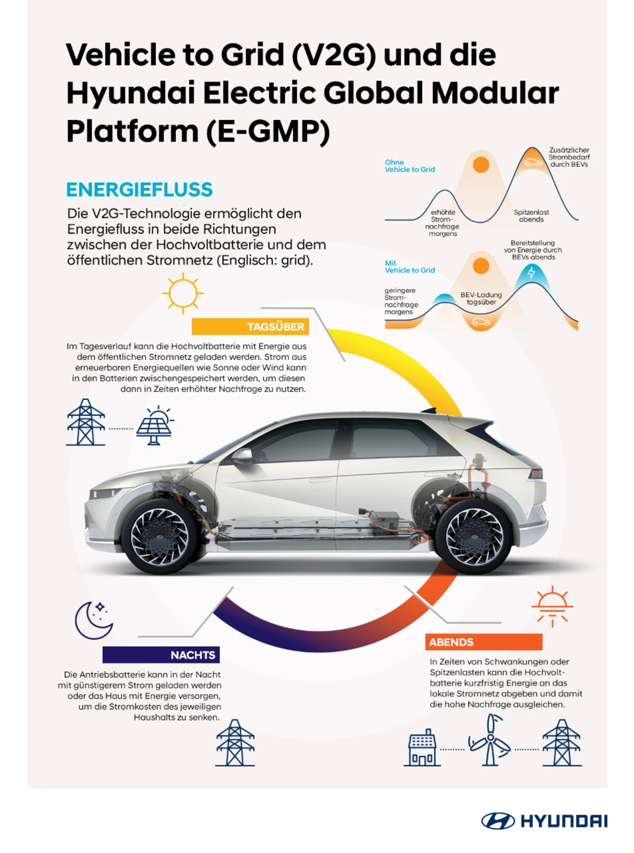 V2L und V2G sind technisch verwandt, arbeiten jedoch mit unterschiedlichen Softwarelösungen. Für den Austausch der Energie mit dem Stromnetz im Rahmen von V2G muss zunächst ein Kommunikationsprotokoll zwischen dem BEV und dem Netz definiert werden. Hyundai plant, den für bidirektionales Laden geeigneten On-Board Charger, der auch in den Serienmodellen des Ioniq 5 verbaut ist, zu einem späteren Zeitpunkt auch für die V2G-Technologie nutzbar zu machen. Darüber hinaus will Hyundai demnächst ein neues Elektrofahrzeug vorstellen, das ab Werk über die V2G-Technologie verfügt.