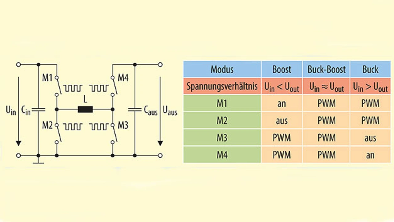 Die selbstregelnde, synchrone H-Brücke in Bild 6 kombiniert eine synchrone Boost-Stufe mit einer synchronen Buck-Stufe. Dieses Konzept ist eine effiziente Lösung für Schaltungen, bei denen die Ausgangsspannung an der Last etwa im Bereich der Eingangsspannung liegt, wie bei kurzen Ketten von wenigen High-Power-LEDs oder Laserdioden. Auch bei den typischen Schwankungen der Eingangsspannung von 8 bis 20 V bleibt der Wirkungsgrad einer Kette mit beispielsweise vier High-Power-LEDs (Ausgangsspannung 12 bis 16 V) über 94 Prozent.