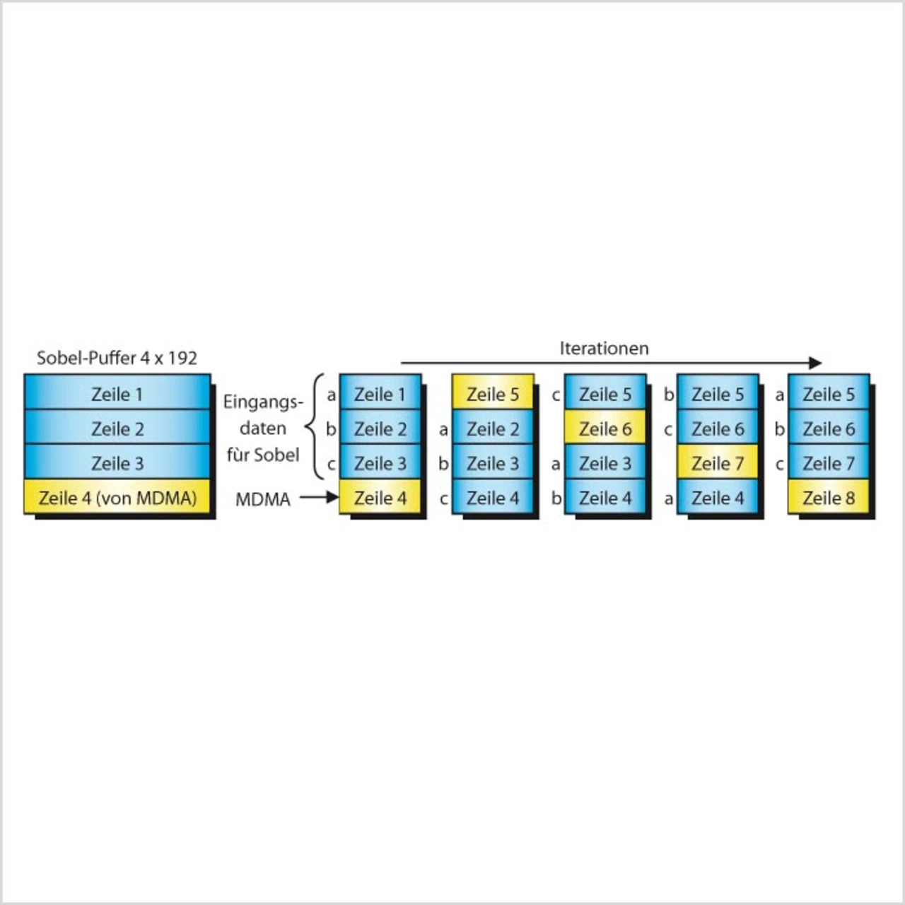 Listing 2 zeigt den eingesetzten C-Code. In der inneren Schleife sind zwei Operationen zu finden. Sie stellen jeweils eine Faltung dar, die aber auf zwei verschiedene Faltungsmatrizen angewendet werden. Durch die lineare Anordnung der Daten per DMA-Kanal kann die Faltung mit einer Adresserhöhung von 1 vollzogen werden. Das passt besser zur Architektur des Blackfin-Prozessors. Nach neun Iterationen der inneren Schleife muss die äußere Schleife eine Adress-Aktualisierung um 3 vornehmen. Damit wird garantiert, dass die Matrizen jeweils eine Zeile nach unten verschoben werden.
