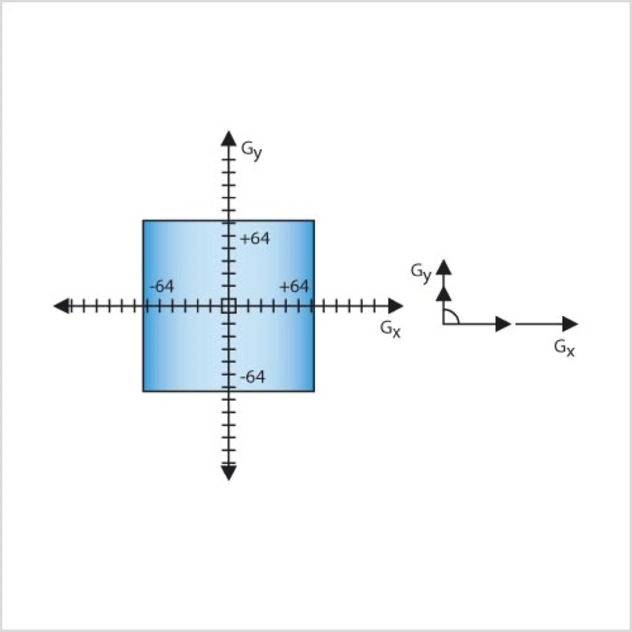 Die Berechnung der Winkel kann auch mittels Arkus-Tagens-Tabelle durchgeführt werden. Die Werte Gx und Gy einer zugehörigen Bildkante identifizieren eine Position in der Arkus-Tangens-Tabelle. In dieser Position ist der zugehörige Winkel zu finden. Hierfür ist zuvor eine Tabelle an zulegen, die eine ausreichende Winkelauflösung zur Verfügung stellt. Wie in Bild 5 zu sehen ist, wurde eine Tabelle der Größe 128 × 128 erstellt. Sie ist mittig zentriert und bietet somit die Winkel für Bildkanten im Wertebereich von –64 bis +64. Für alle Kantenstärken, welche diesen Bereich überschreiten, muss eine Normierung stattfinden. Diese wird erreicht, indem man den größten der beiden Werte (Gx, Gy) so oft teilt (Division = Wert nach rechts schieben), bis er kleiner oder gleich 64 wird. Um trotzdem einen korrekten Winkel zu erhalten, muss auch der kleinere der beiden Werte proportional reduziert werden (Listing 6).