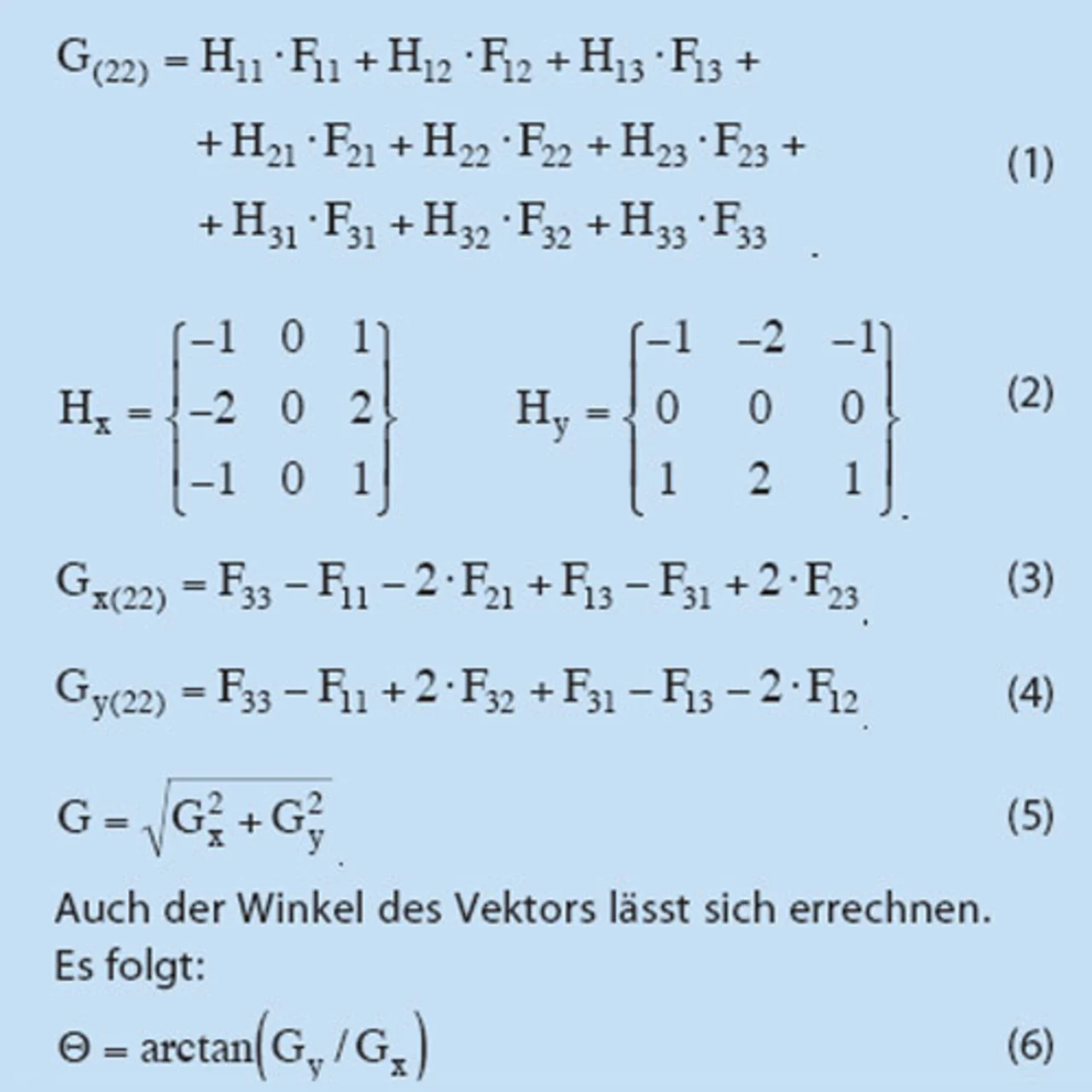Eine zweidimensionale Faltung besteht somit aus der Summe von neun Multiplikationen. Für das Sobel-Filter müssen zwei Faltungen pro Bildpunkt ausgeführt werden, eine für Kanten in horizontaler Richtung Gx und eine für Kanten in vertikaler Richtung Gy. Aus den Ergebnissen können anschließend die tatsächliche Kantenstärke Gxy und der tatsächliche Winkel Theta ermittelt werden. In Gleichung (2) sind die Sobel-Operatoren gezeigt. Die Gleichungen (3) und (4) zeigen die Berechnungen, die durch Einsetzen der Matrixwerte entstehen.