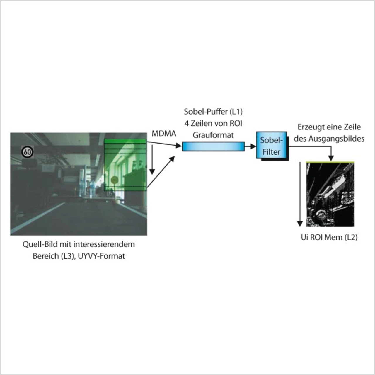Zunächst wird Gleichung (5) und Gleichung (3) direkt eingesetzt. Eine Region (192 × 256 × 8 bit) des im externen Speicher liegenden Bildes wird zeilenweise ausgelesen und in den internen Speicher transferiert. Es liegen nun drei Zeilen der gewünschten Region in 16 bit Breite im Speicher (3 × 192 × 16 bit) und die Berechnung kann beginnen. Zeitgleich wird die vierte Zeile in den internen Speicher übertragen; sie wird für die Berechnung der zweiten Zeile benötigt. Auf Grund dieser Vorgehensweise werden nach und nach alle Zeilen übertragen und berechnet, während die jeweils alte Zeile verworfen wird. Bild 2 zeigt die Vorgehensweise schematisch. Da die Zeilen im internen Speicher nicht mehrfach umkopiert werden sollen, werden die Zeiger immer wieder neu berechnet. Bild 3 zeigt die Speicheraufteilung und den Lauf der Zeiger a, b und c. Der Programmcode in Listing 1 zeigt, wie die Faltung implementiert wurde. Die Variablen a, b und c zeigen auf die jeweils aktuellen Zeilen. Die Ergebnisse Gx und Gy werden verschachtelt in einer Tabelle abgelegt. Speicherzugriffe sind nur noch für Bilddaten nötig, da die Koeffizienten direkt in die Gleichung codiert wurden. So konkurrieren die Zugriffe für Bilddaten nicht mit Zugriffen auf Koeffizienten-Matrizen. Hinzu kommt, dass manche Operationen im ersten Abschnitt deckungsgleich mit einigen im zweiten Abschnitt sind. Der Compiler erkennt diese Wiederholungen und reduziert die Anzahl der Operationen. Die FOR-Schleife wird durch eine Hardware-Schleife ersetzt. Für pipeline-basierte Prozessoren hat dies einen großen Vorteil: Die Anweisungen innerhalb der Schleife werden pro Iteration automatisch wieder in die Pipeline geschoben, ohne dass Strafzyklen vergeben werden.