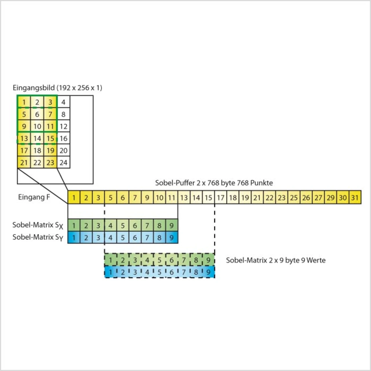 Da die Sobel-Operatoren mehrere Nullen in der Matrix aufweisen, kann die Anzahl der Multiplikationen reduziert werden. Wie man sieht, werden nur noch sechs Akkumulationen benötigt. Da die Matrizen der Sobel-Operatoren einige Positionen mit 1 belegen, muss dort keine Multiplikation stattfinden. Nur die Positionen mit dem Wert 2 müssen genauer betrachtet werden. Alternativ kann dies aber auch durch Schieben um 1 nach links realisiert werden. Dies macht die Berechnung per Sobel so effizient. Die Intensität jeder Kante wird durch die geometrische Addition der Werte Gx und Gy berechnet. Der Ergebnisvektor zeigt dies durch seine Länge an, wie in den Gleichungen (5) und (6) dargestellt.
