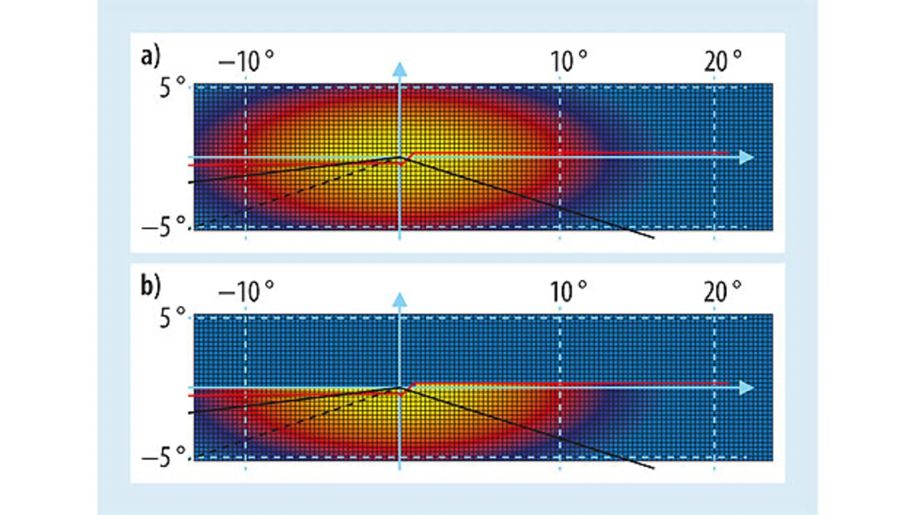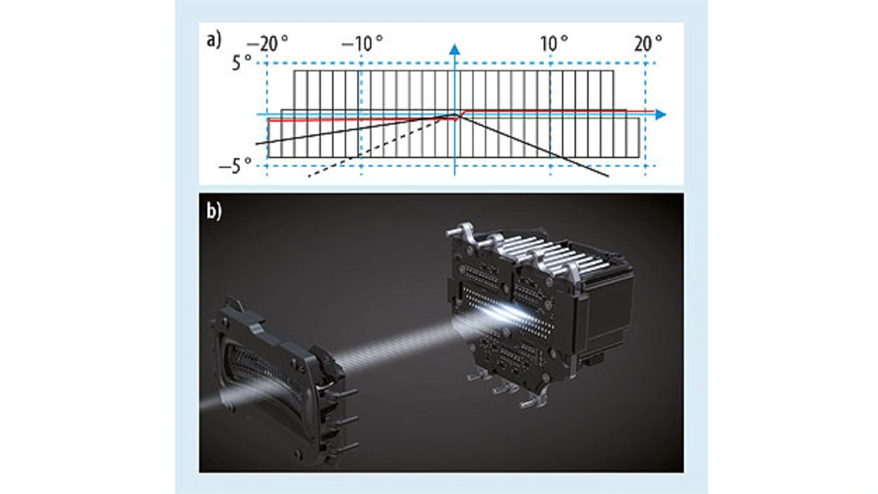 Auf der anderen Seite repräsentieren additive LED-Pixel-Arrays den am besten energieoptimierten Ansatz. Bild 8 zeigt den aktuellen Stand der Technik beispielsweise bei Daimler zur Realisierung einer adaptiven Beleuchtung auf Basis diskreter LEDs, wie der Oslon Compact CM.Die entwickelte Primäroptik streckt die obere und untere Pixelreihe auf mehrere Grad vertikal, lässt aber die horizontale Auflösung bei ~1,2°. Das reduziert die erforderliche Anzahl von LEDs und ermöglicht den Einsatz herkömmlicher Integrationsmethoden.