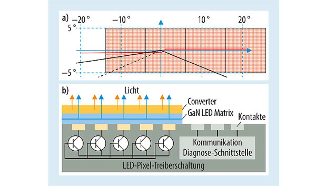 Bild 9 zeigt den Ansatz der Hybrid-LED »Eviyos« (Efficient, Versatile, Intelligent, µ-structured LED Chip von Osram Opto Semiconductors) von Osram. Ein großer LED-Pixel-Array-Chip ist direkt mit dem aktiven Silizium-IC verbunden und adressiert die einzelnen Lichtquellen (Bild 9b). Daher kann der Anschlussbedarf von je zwei Pads pro LED an eine Stromquelle auf eine Spannungsversorgung und eine digitale serielle Schnittstelle reduziert werden. Im Fall der Eviyos sind das 1.024 Pixel auf circa 4 mm x 4 mm. Das Sichtfeld wird dabei von vier nebeneinander liegenden Einheiten abgedeckt – die horizontale und vertikale Auflösung beträgt etwa 0,25° (Bild 9a).