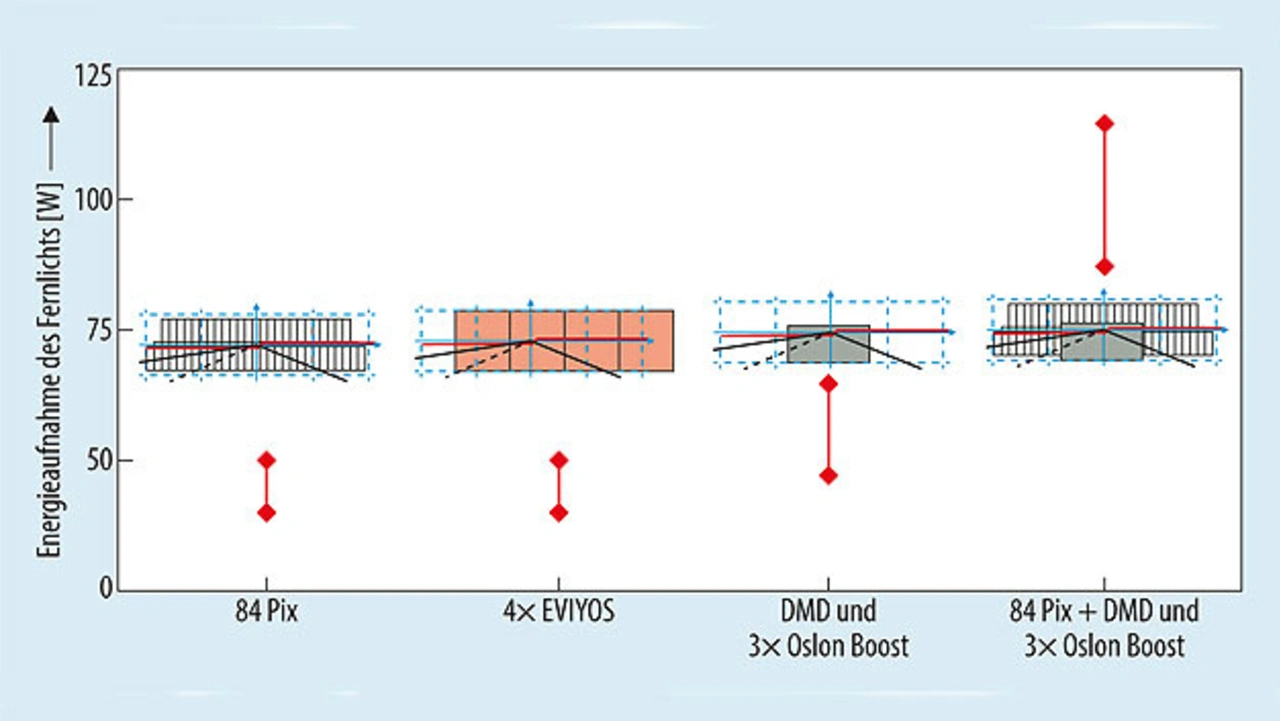 Die gleiche Optik überträgt damit aus den 2.500 lm rund 1.000 lm auf die Straße. Um den Energiebedarf eines Scheinwerfers mit 84 LED-Pixeln einzuschätzen, wird ein durchschnittlicher PWM-Wert von 33,3 Prozent angenommen, der die LEDs mit 0,5 A und 3,2 V betreibt – ungefähr 45 W. Eine mögliche Lichtquelle für ein DMD von rund 0,55 Zoll wären beispielsweise drei Oslon Boost mit einer Emissionsfläche von jeweils 2 mm². Die drei LEDs arbeiten zwischen 4,5 bis 6 A und ~3,5 V – die Leistungsaufnahme liegt zwischen 46 und 65 W. Bild 11 zeigt den Leistungsvergleich von vier nachfolgenden Ansätzen: