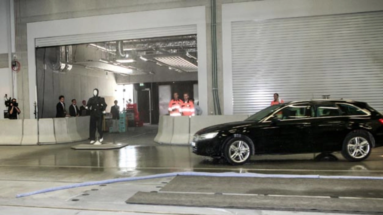 Bei der Eröffnung erhielt alle Teilnehmer einen Vorgeschmack auf die modernen Testmethoden: Demonstriert wurde ein neuartiger Brems-Lenk-Versuch mit einem autonom fahrenden Testfahrzeug und einem realistischen Fußgänger-Dummy. Auf einer Anlaufstrecke von 60 m beschleunigt das Fahrzeug in der radar- und lidartauglichen Halle auf 40 km/h. Der Niederschlag aus der hauseigenen Regenanlage behindert die Sicht der vorausschauenden Sensoren, wie auch in der Realität die des Menschen. Von rechts kreuzt plötzlich ein eigens entwickelter Fußgänger-Dummy, der mit seinen lebensnahen Bewegungen von Sicherheitssystemen zweifelsfrei als Passant erkannt werden muss. Zusätzlich erhöht die Feuchtigkeit den Bremsweg aufgrund des gesenkten Reibwerts der Reifen. Zur bestmöglichen Unfallvermeidung wird deshalb nicht nur wie heute üblich in die Bremse eingegriffen, sondern aktiv vom ungeschützten Verkehrsteilnehmer weggelenkt. Das Fahrzeug reagiert in unter einer Sekunde bis zum eigentlichen Impact und die Kollision wird somit effektiv vermieden. Die reproduzierbaren Bedingungen in der Halle ermöglichen es, solche Eingriffe in die Fahrdynamik verlässlich zu validieren. Die Komplexität der Szenarien lässt sich langfristig beliebig steigern. Die eingebaute Positionierungsanlage ermöglicht eine hohe örtliche und zeitliche Präzision. Denkbar wären beispielsweise Tests mit mehreren Verkehrsteilnehmern wie Fahrradfahrern, Skateboardern oder Segway-Touristen.