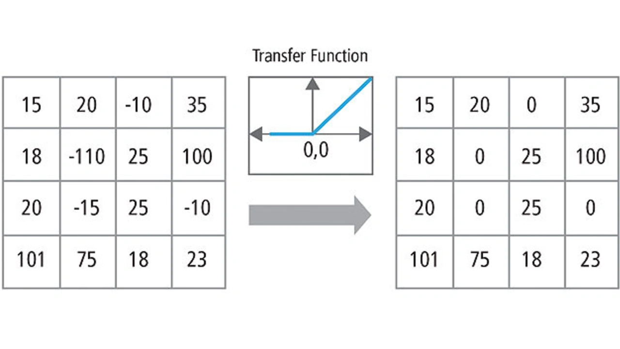 Im Vergleich zu anderen nichtlinearen Funktionen, die in CNNs genutzt werden (z.B. Tangens Hyperbolicus, Absolutwert des Tangens Hyperbolicus und Sigmoid), besteht der Vorteil von ReLU darin, dass sich das Netzwerk deutlich schneller trainieren lässt. Die ReLU-Funktionalität ist in Bild 7 zu sehen, wobei die Übertragungsfunktion über dem Pfeil dargestellt ist.