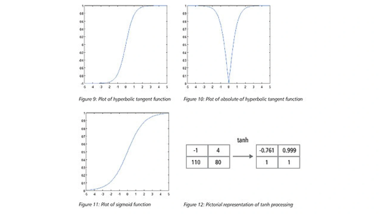 Die nichtlineare Schicht verarbeitet ein Element nach dem anderen für jedes Merkmal. Eine kontinuierliche Trigger-Funktion kann ein Tangens Hyperbolicus sein, der Absolutwert des Tangens Hyperbolicus oder die Sigmoid-Funktion. Bild 8 verdeutlicht, wie eine nichtlineare Funktion (Tangens Hyperbolicus) auf einzelne Elemente angewendet wird.