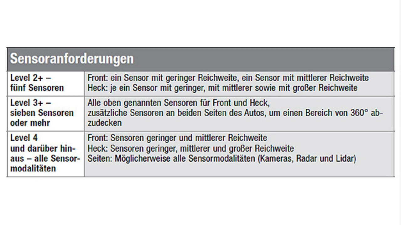Bis Level 3+ können Bildverarbeitung und Radar die gestellten Anforderungen auf kosteneffiziente Weise erfüllen. Geht es aber um Level 4 und darüber, werden möglicherweise alle drei verfügbaren Sensormodalitäten einschließlich Lidar benötigt (Tabelle 1). Aus kaskadierten Transceivern aufgebaute Radarsensoren warten zu optimierten Kosten mit Lidar-ähnlicher Performance auf. Weil zudem der Platz außen am Auto knapp wird, wenn immer mehr Sensoren verbaut werden müssen, bietet die multimodale Funktionalität der Radartechnik den Entwicklern die Chance, die Zahl der benötigten Sensoren zu reduzieren.