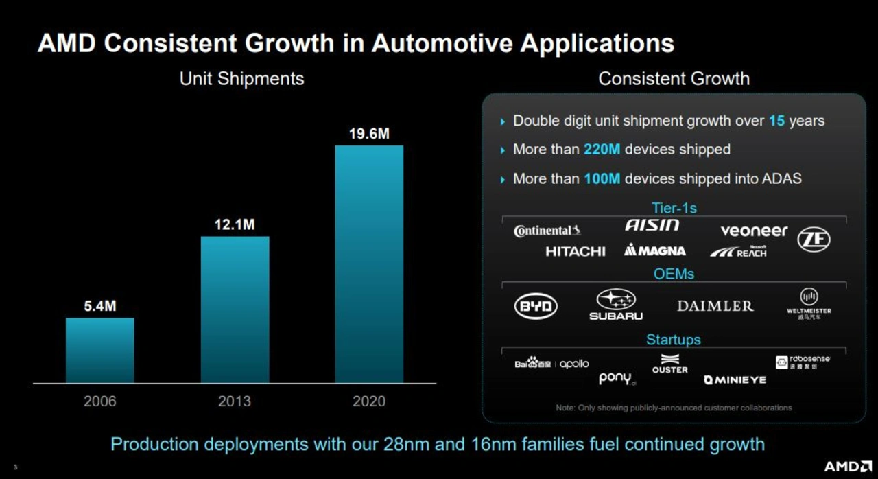 Wayne Lyons, Marketing Director, Automotive bei AMD, erklärt: »Die 16-nm-Bausteine können die Daten mehrerer Sensor- und Kameraeingänge verarbeiten und zu einem funktional sicheren Einparksystem kombinieren, das dynamische Szenarien genau versteht und darauf reagieren kann.« Er erklärt weiter, dass AISIN nur ein Beispiel in der Erfolgsgeschichte von AMD im Automotive-Markt ist und verweist in diesem Zusammenhang darauf, dass die ausgelieferten Stückzahlen seit 2006 von 5,4 Mio. Einheiten auf 19,6 Mio. angestiegen sind. Insgesamt seien mittlerweile schon mehr als 220 Mio. Bausteine in die Automobilindustrie geliefert worden, über 100 Mio. davon sind in ADAS-Anwendungen gewandert. Laut Lyons gibt es viele AMD-basierte Systeme in den Fahrzeugen, angefangen bei LiDAR-Systemen, Frontkameras und 4D-Radar, über Elektrofahrzeuge, In-Cabin-Überwachung bis hin zu Domainen-Controllern.