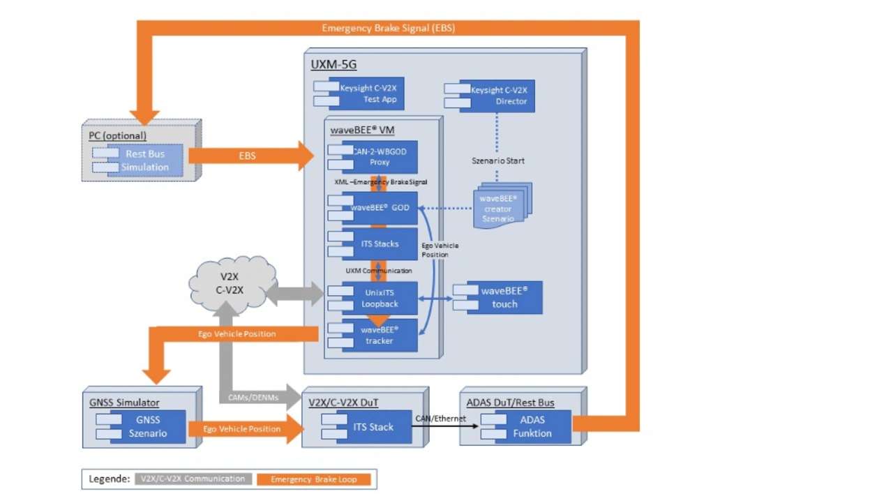 Die Ausführung des Testszenarios, die zentrale Ablaufsteuerung sowie die Erzeugung der V2X-Nachrichten erfolgen in diesem Set-up auf einer UXM-5G-Wireless-Testplattform von Keysight Technologies, in die die entsprechenden waveBEE-Softwarekomponenten für die GNSS-Ansteuerung sowie das Erzeugen der V2X-Nachrichten als virtuelle Maschine integriert wurden.