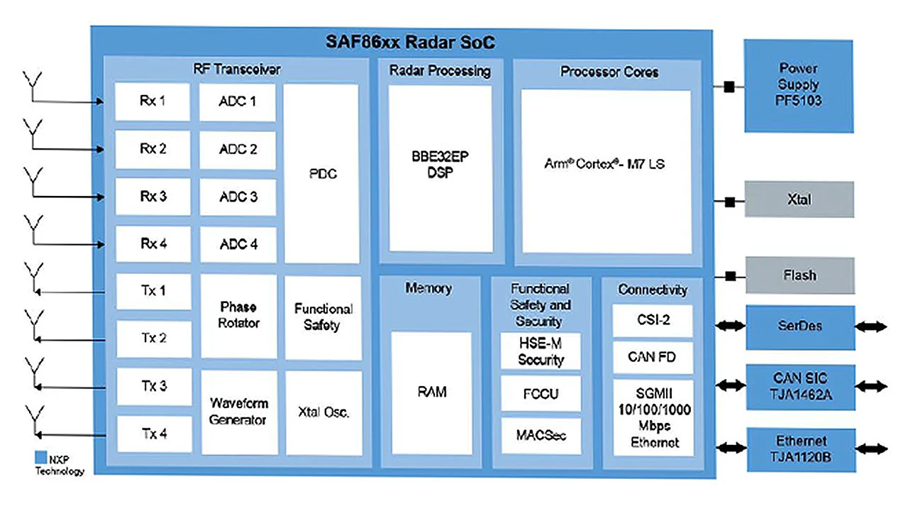 Das Zusammenspiel all dieser Technologien lässt sich gut anhand der brandneuen NXP-SAF86xx-Automotive-Radar-One-Chip-Familie veranschaulichen. Diese vereint einen leistungsstarken Radar-Transceiver, einen Multicore-Radarprozessor und eine MACsec-Hardware-Engine für die hochmoderne sichere Datenkommunikation über Automotive Ethernet (Bild 2).