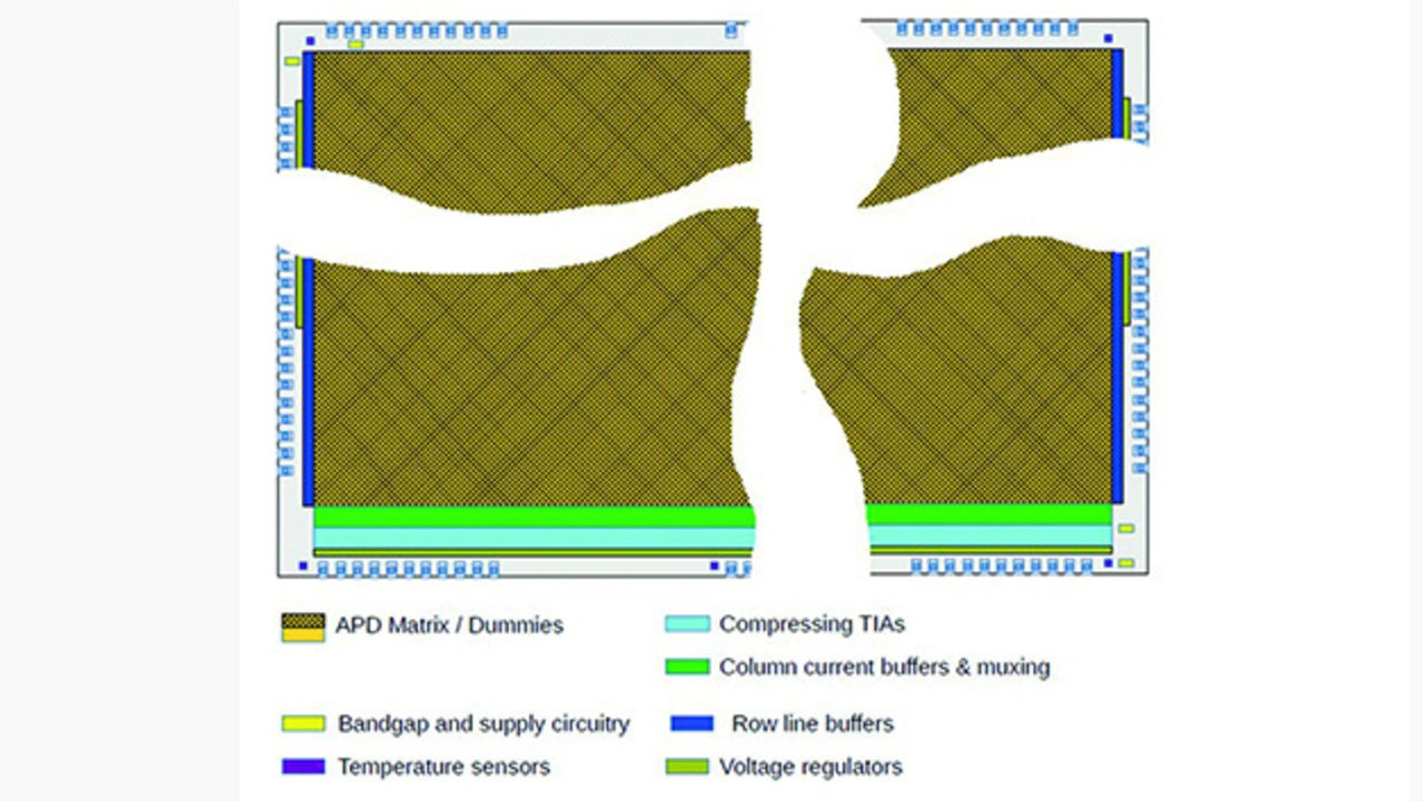 Hier eröffnen APD-Arrays auf CMOS-Basis (Bild) dank integrierbarer Schaltelemente deutliche Verbesserungen. Broadcom entwickelt solche Detektoren mit bis zu 20.000 Bildpunkten. Wichtigstes Merkmal sind im Chip integrierte TIA, denen mehrere Pixel zugeordnet sind. Die Zuordnung ist flexibel und hängt von der jeweiligen Konfiguration ab. Eine einfaches Set-up ist zum Beispiel ein TIA pro Spalte. Die Photoströme aller Pixel dieser Spalte sind dann auf diesem TIA-Kanal zusammengefasst. Pro TIA gibt der Detektor das vorverstärkte Amplitudensignal aus.