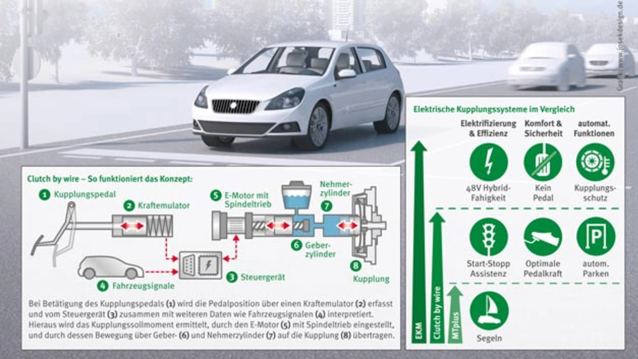 In der Ausbaustufe Clutch-by-wire wird die mechanische oder hydraulische Anbindung des Pedals an das Ausrücksystem vollständig ersetzt. Die jetzt fehlende Gegenkraft des Ausrücksystems auf das Pedal wird über einen von Schaeffler neu entwickelten Pedalkraftsteller erzeugt. Dieser enthält zudem einen Sensor, der die Pedalstellung an den Kupplungsaktor meldet. Dadurch nimmt der Fahrer nicht unmittelbar wahr, dass die Kupplungsbetätigung automatisiert ist, sondern fährt weiterhin, wie er es vom Handschalter gewohnt ist. Das eigentliche Öffnen und Schließen der Kupplung übernimmt in allen Fahrsituationen ein neu entwickelter, intelligenter Aktor. Er besteht aus einem Grundaktor, der die gesamte Elektronik, den E-Motor und einen Spindeltrieb beinhaltet. Die anwendungsspezifische Anbindung an die Kupplungsbetätigung übernimmt ein mechanisches oder hydraulisches Modul. Der modulare Aufbau macht ihn universell einsetzbar und reduziert sowohl die Entwicklungs- als auch die Systemkosten. Dies ist wichtig, um den Kostenvorteil der Schaltgetriebe gegenüber den Automatikgetrieben zu erhalten.