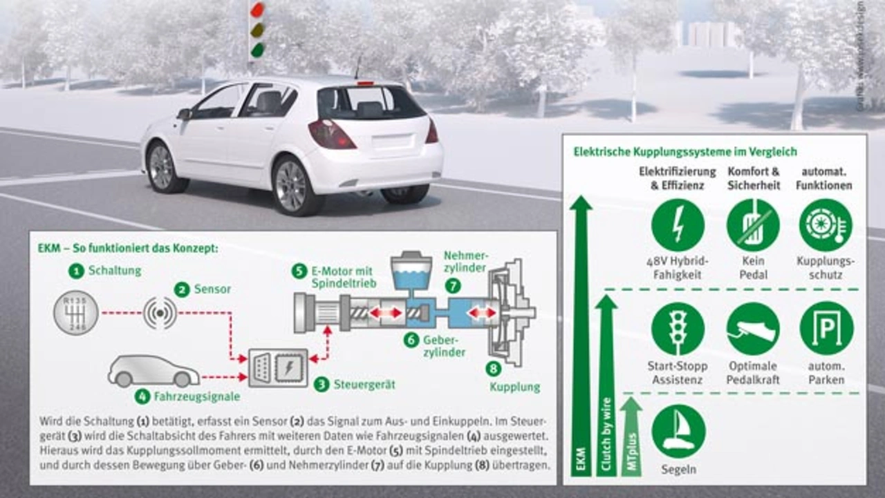 Technisch auf der gleichen Basis steht das Elektronische Kupplungsmanagement (EKM), verzichtet jedoch auf das Kupplungspedal. Das Signal zum Auskuppeln liefert ein Sensor in dem Moment, in dem der Fahrer zum Schalten ansetzt. Ebenso erfolgt das Einkuppeln automatisch, wenn der Gang eingelegt ist. Der noch höhere Automatisierungsgrad von EKM bietet gute Voraussetzungen, um einen Elektromotor in den Antriebsstrang zu integrieren. Bei entsprechend dimensionierter Batterie in einem 48-V-Bordnetz übernimmt dieser den Vortrieb in allen Fällen, in denen der Verbrennungsmotor unwirtschaftlich arbeitet - zum Beispiel beim Einparken, im Stop-and-Go-Verkehr oder im Stadtbetrieb bei geringer Geschwindigkeit. "EKM ermöglicht einen technisch eleganten und wirtschaftlichen Einstieg in die milde Hybridisierung, wie er so mit einem Automatikgetriebe nicht darstellbar wäre", erläutert Welter.