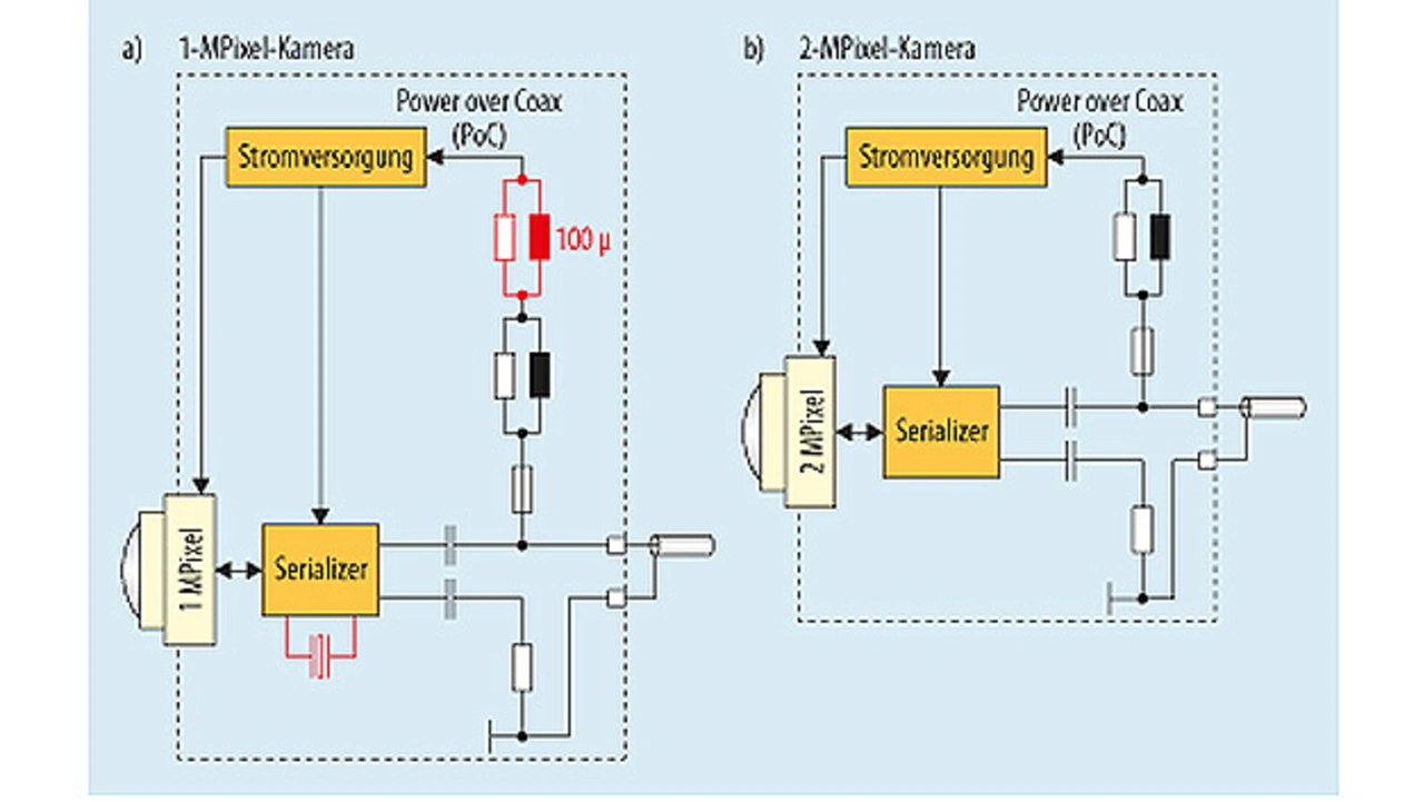 Eine neue Gattung von SerDes-Bausteinen erhöht inzwischen die Performance von 1 MPixel auf 2 MPixel und mehr, während gleichzeitig die Kamera¬abmessungen verringert werden (Bild 9b). Der 2 MPixel-Serializer wird über den Rückkanal von der ECU getaktet, sodass kein lokaler Oszillator benötigt wird. Dies wiederum hat zwei grundlegende Vorteile: Erstens spart der Entfall des Oszillators Platz bei gleichzeitiger Verbesserung der Zuverlässigkeit und zweitens sind die Videosignale aller Kameras zu einem zentralen Takt synchronisiert, was die Videoverarbeitung vereinfacht. Der schnellere Rückkanal ermöglicht außerdem (abhängig vom Rauschen der Stromversorgung für den Bildaufnehmer) den Verzicht auf das große PoC-Filter (100 µH), was ungefähr 50 mm² Leiterplattenfläche spart. Unter dem Strich entsteht also eine leistungsfähigere und dabei gleichzeitig kleinere Kamera.