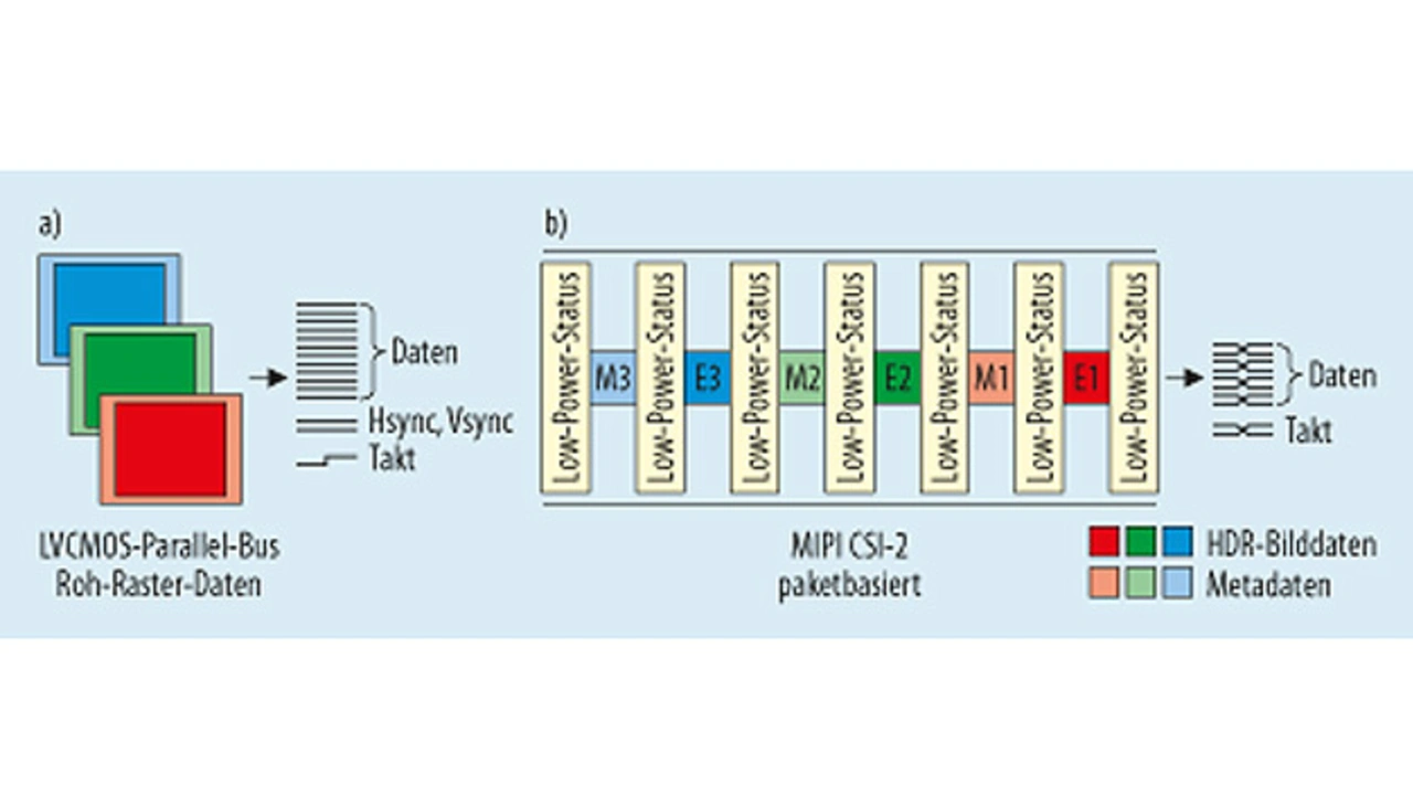 Zur Lösung dieser Probleme setzt man in Automotive-Anwendungen auf den bereits erwähnten MIPI-CSI-2-Standard (Bild 10b). CSI-2 ist ein quasi serialisierter differenzieller Bus, der bei geringer Leistungsaufnahme und niedrigem EMI-Aufkommen einen hohen Durchsatz ermöglicht. CSI-2 ist außerdem paketbasiert und unabhängig von der Pixeltakt-Frequenz (PCLK) der Bildsensoren. Die Pakete werden über den CSI-2-Bus burstweise und mit fester Frequenz übertragen, während in den dazwischenliegenden Leerlaufphasen ein Low-Power-Status aktiviert wird. Diese Architektur entkoppelt die Pixelfrequenzen der Bildsensoren vom Datenübertragungsweg, was das Bündeln und Verarbeiten von Videosignalen aus mehreren Kameras mit unterschiedlichen Auflösungen, Frame-Raten und Bildformaten erleichtert. CSI-2-Pakete enthalten Header mit Feldern für Dateninhalt und Kanal. Dies wiederum erleichtert den Prozessoren die Unterscheidung von Video-, Aufnahme- und Metadaten mehrerer Kameras, ohne dass die eingefügten Bits gezählt werden müssen. Schließlich wartet CSI-2 mit weiteren Features wie der CRC-Datenabsicherung auf, um die Robustheit und funktionale Sicherheit des Systems zu steigern. CSI-2 stellt damit insgesamt ein moderneres Konzept für eine Videoschnittstelle dar und macht es einfacher, Sensoren unterschiedlicher Art und Geschwindigkeit in Sensorfusionssystemen zusammenzufassen.