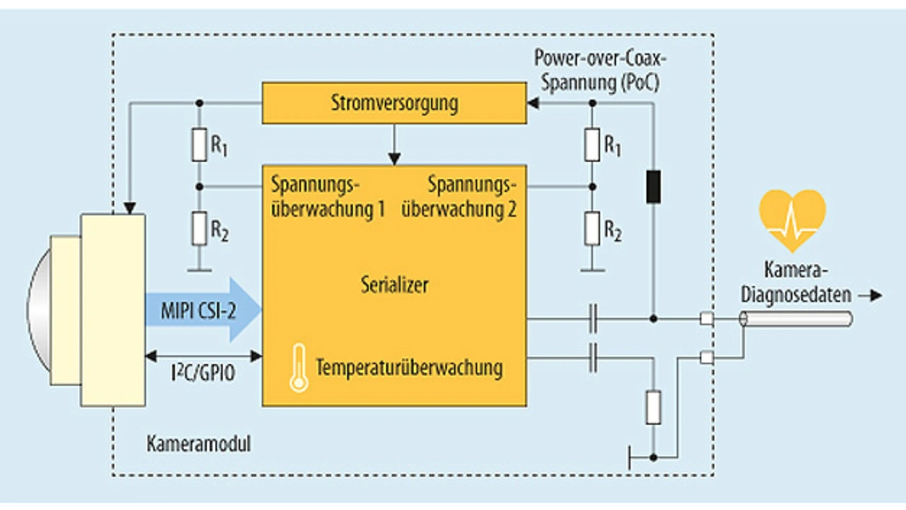 Bis zu zwei Spannungen können auf zu hohe oder zu niedrige Werte überwacht werden. Externe Spannungen werden auf einen nominellen Wert herabdividiert, sodass selbst PoC-Spannungen, die größer sind als die Versorgungsspannung des Chips, kameraintern überwacht werden können. Mit Hilfe dieser Diagnosen lässt sich das Kameramodul kontinuierlich auf ordnungsgemäße Funktion überprüfen und vor einem Kameraausfall wird ein Systemalarm ausgelöst. Zusammen mit der Datenabsicherung verbessern die Diagnosefunktionen die Robustheit und Zuverlässigkeit der Kamera, was zur funktionalen Sicherheit des gesamten Systems beiträgt.
