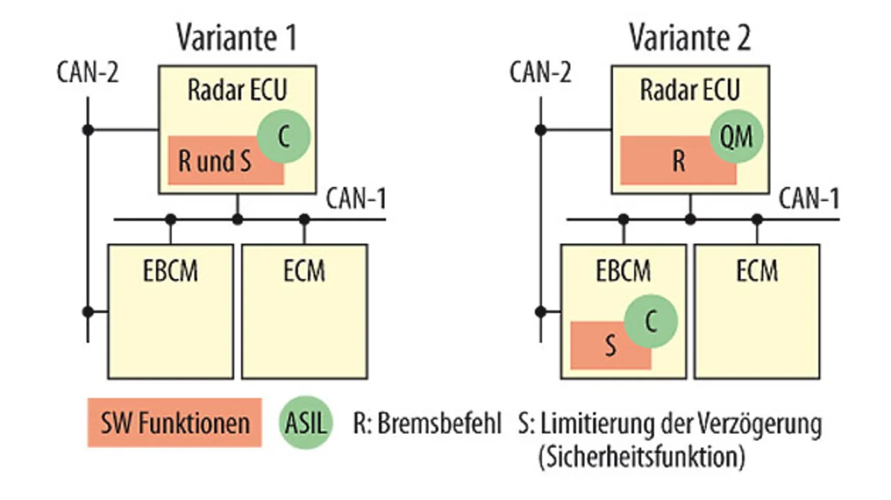 Ein weiteres Beispiel soll die Auswirkungen von verschiedenen Leistungscharakteristiken und unterschiedlichen ASIL-Dekompositionen verdeutlichen. Wird die Verzögerungswirkung des „Collision Imminent Braking“ eingeschränkt auf unterhalb einer festgelegten Hazard-Metrik, zum Beispiel 0,4 g, so ist das Feature als QM einzustufen. Jedoch muss die Sicherheitsfunktion nach dem höchsten ASIL ausgelegt werden, weil durch zufällige Hardware-Fehler hervorgerufene Fehlfunktionen bei der G&R zu berücksichtigen sind. Bild 3 zeigt zwei mögliche Auslegungen. Weil bei Variante 2 sich die zusätzliche Sicherheitsfunktion auf dem Electronic Brake Controller (EBCM) mit minimalem Zusatzaufwand realisieren lässt, ist diese Variante aus Kostengründen zu präferieren