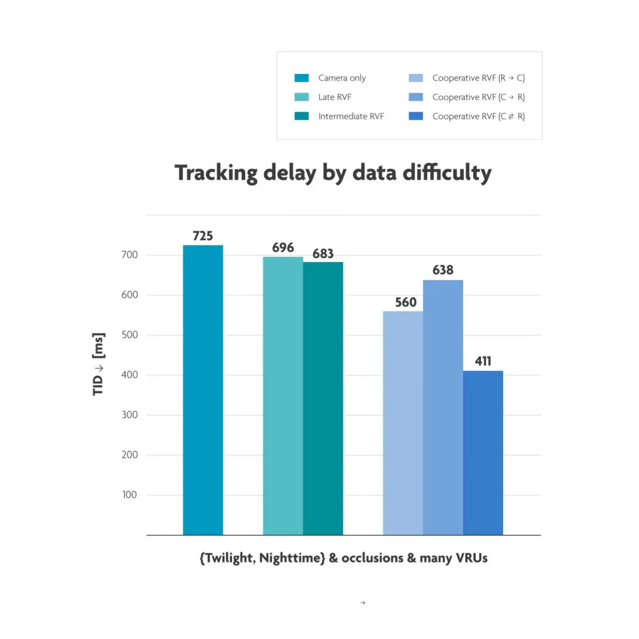 »Auch bei der Minimierung der Latenz, also der Verzögerung bei der Verfolgung, haben wir große Fortschritte gemacht. Bei schwierigen Wetter- und Verkehrsbedingungen erreichen wir jetzt beispielsweise eine Latenz von 411 ms. Das ist eine Verbesserung um mehr als 40 % gegenüber der Latenz, die bei reinen Kamerasystemen (725 ms) und bei der Late Fusion (696 ms) auftritt.«