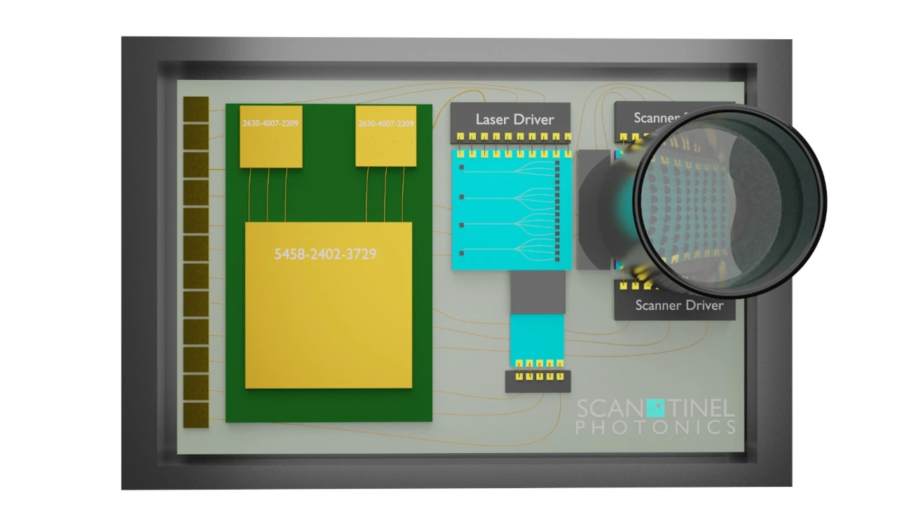 Scantinel entwickelt derzeit ein optoelektronisches FMCW-Lidar-Modul (OCM), das auf einer CMOS-kompatiblen photonischen Integrationsplattformen basiert. Das Modul besteht aus einem Solid-State-Scanning-PIC mit einer Parallelisierung von FMCW-Kanälen. Das sogenannte Solid-State-Scanning benötigt keine beweglichen Elemente wie zum Beispiel bei MEMS-basierenden Lidar-Systemen, was das System deutlich robuster und weniger störanfällig macht.