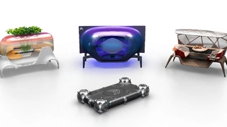 Immersive Air ist ein Design für mehrere Passagiere. Es verfügt über eine dominante ovale Form, die von einem vertikalen, rechteckigen Rahmen in der Mitte durchzogen wird. Die Außenseite ist mit einem kontrastierenden dunklen Überzug versehen und durch ein metallisch glitzerndes, parametrisches Muster hervorgehoben.