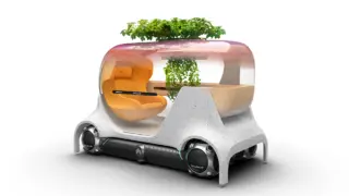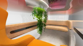 Hinzu kommen eine verbesserte Privatsphäre und Entspannung durch eine verstellbare, lichtdurchlässige Decke, die zur visuellen Isolierung heruntergeklappt werden kann, um dem Fahrgast ein geschütztes Gefühl zu vermitteln. Ein zweiter Sitz auf der gegenüberliegenden Seite ist für private Gespräche vorgesehen. Dieser Sitz besteht aus Kork, wobei die Rückenlehne als Armlehne zur Seite hin verlängert ist. Der Innenraum bietet einen integrierten Luftreiniger und selbstbewässernde Grünpflanzen für ein gesundes, angenehmes Kabinenerlebnis. Die recycelte Basis und der von Kork dominierte Innenraum machen diesen Pod zu einem umweltfreundlichen Design-Statement.