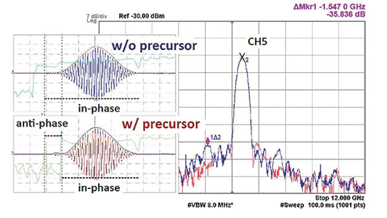 Experimente mit der IC-Implementierung von Imec zeigen, dass sie die ToA-Messleistung und die UWB-Entfernungspräzision effektiv verbessert. Die durch den Sender erzielte Leistungsverbesserung (unter Beibehaltung der spektralen Konformität) ist in Bild 5 dargestellt. Die Pulsmischschaltung hält zusammen mit der Resynchronisation die Nebenkeulenunterdrückung von -35 dBc sowohl ohne als auch mit Vorläuferpulsen aufrecht, während mit den Vorläuferpulsen die Anstiegszeit der Vorderflanke des Hauptpulses von 700 ps auf 550 ps reduziert wird.