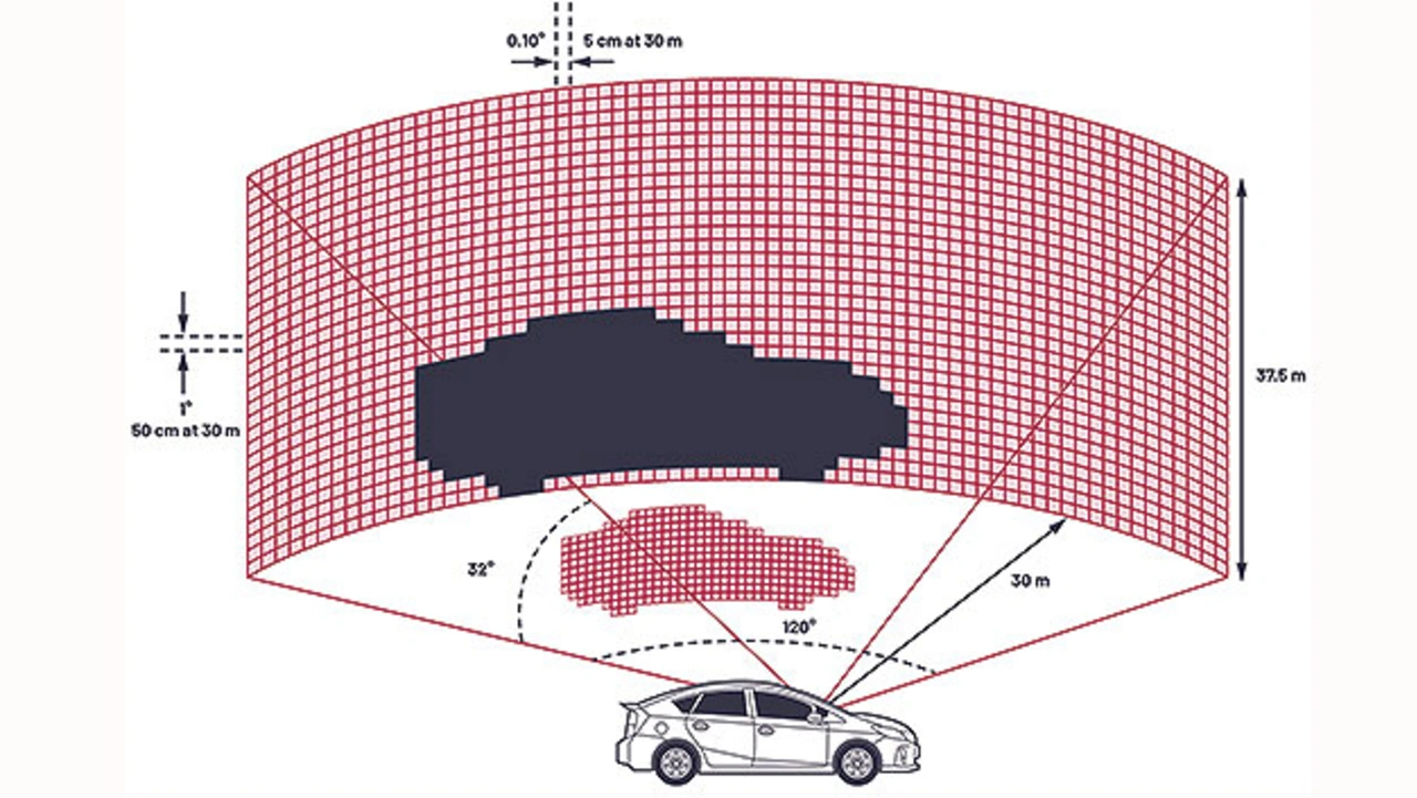 Schließlich sind Gegenstände auf der Straße, Verkehrsschilder und selbst Motorräder typischerweise kleiner als 3,5 m. Bei einem System mit 0,1° Winkelauflösung sind die Pixel dagegen um den Faktor zehn kleiner, sodass ein durchschnittlich breites Auto in 200 m Entfernung etwa fünf benachbarte Rücksignale ergeben dürfte. Die meisten Autos sind außerdem breiter als hoch, sodass ein solches System in der Lage sein müsste, ein Auto von einem Motorrad zu unterscheiden.