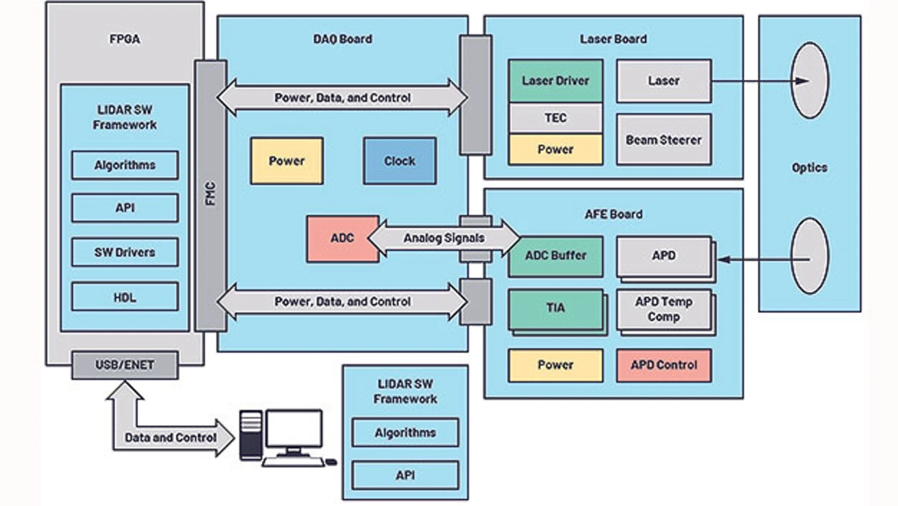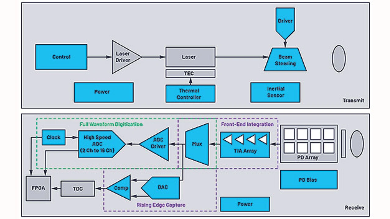 Das System besitzt eine Laserquelle mit 905 nm Wellenlänge, angesteuert durch den ADP3634, einen schnellen Dual-MOSFET mit 4 A Nennstrom. Hinzu kommt ein 16-kanaliges First Sensor APD-Array, dessen Versorgungsspannung durch die programmierbare Stromversorgung LT8331 bereitgestellt wird. Es sind ferner mehrere vierkanalige, rauscharme Breitband-TIAs des Typs LTC6561 eingebaut sowie ein 8-bit-ADC AD9094 mit 1 GS/s, der mit 435 mW eine besonders geringe Leistungsaufnahme pro Kanal aufweist.