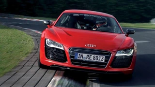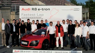 Der R8 e-tron hat auf der Nürburgring-Nordschleife die Bestzeit für Serienfahrzeuge mit Elektroantrieb aufgestellt. 8:09,099 Minuten brauchte der Hochleistungssportwagen für den 20,8 Kilometer langen Kurs.