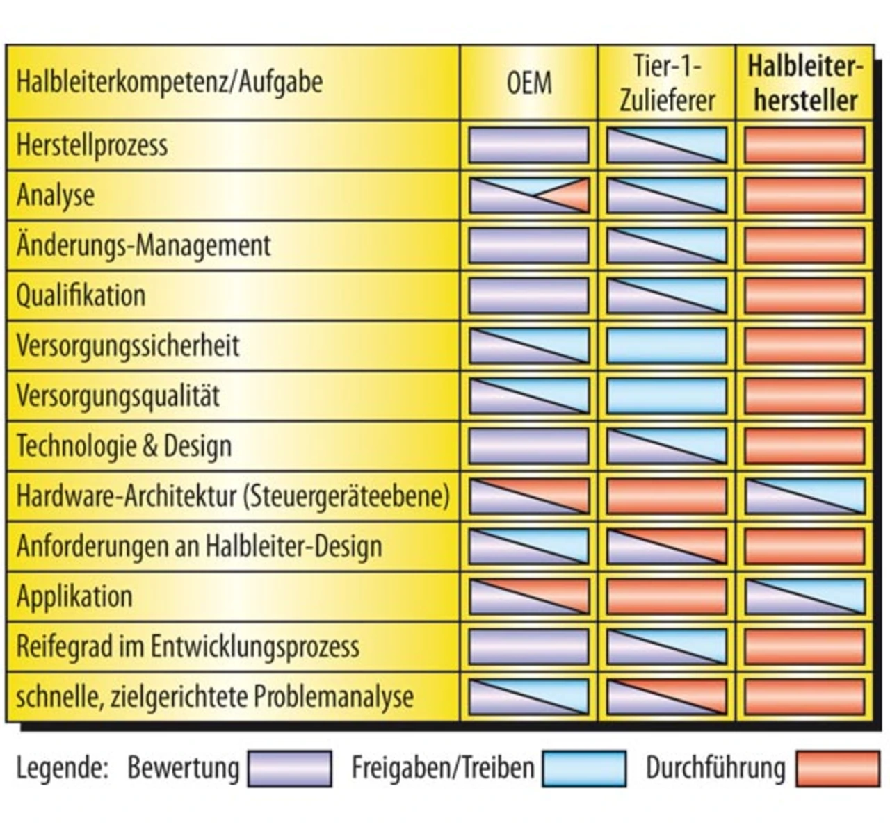 Gemäß der Soll-Kompetenzen entlang der Lieferkette muss bei OEM, Tier-1-Zulieferer und Halbleiterhersteller ein Kompetenzaufbau bzw. eine Kompetenzentwicklung stattfinden. Diese auf Tier-1-Ebene einzufordern, ist dabei Aufgabe des OEM. Hier gilt es, neben der Festlegung von Konsequenzen - z.B. negative wirtschaftliche Folgen bei der Projektvergabe - auch Lösungen zu finden, mit denen Lieferanten fehlende Kompetenzen auslagern können. Aufgabe des Tier-1-Zulieferers ist das aktive Einfordern der Halbleiterkompetenzen bei seinen Unterlieferanten bis zum Halbleiterhersteller. Sind die notwendigen Kompetenzen hier nicht vorhanden, so könnte beispielsweise der Tier-1-Zulieferer diese zur Verfügung stellen. Aktuelle Entwicklungsprojekte sowie die Serienbegleitung von Steuergeräten zeigen beim Thema Halbleiter ein sehr unterschiedliches Kompetenz-Niveau in der Lieferantenwelt.
