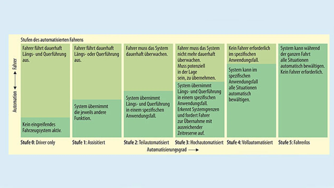 Der Weg zum autonomen Fahren führt über verschiedene Grade der Autonomie, wie sie Bild 2 zeigt. Heutige Serienfahrzeuge befinden sich auf Level 1. Sie sind mit Assistenzfunktionen wie einem Tempomat mit Abstandshalter (Längsführung) oder einem Spurhalte-Assistent (Querführung) ausgestattet. Der Übergang auf Level 4 und 5 wird schnell erfolgen, wobei das Jahr 2021 von vielen Automobilherstellern als das Jahr angepriesen wird, in dem erste Autos der Level 4/5 für autonome Taxi-Flotten zur Verfügung stehen sollen.