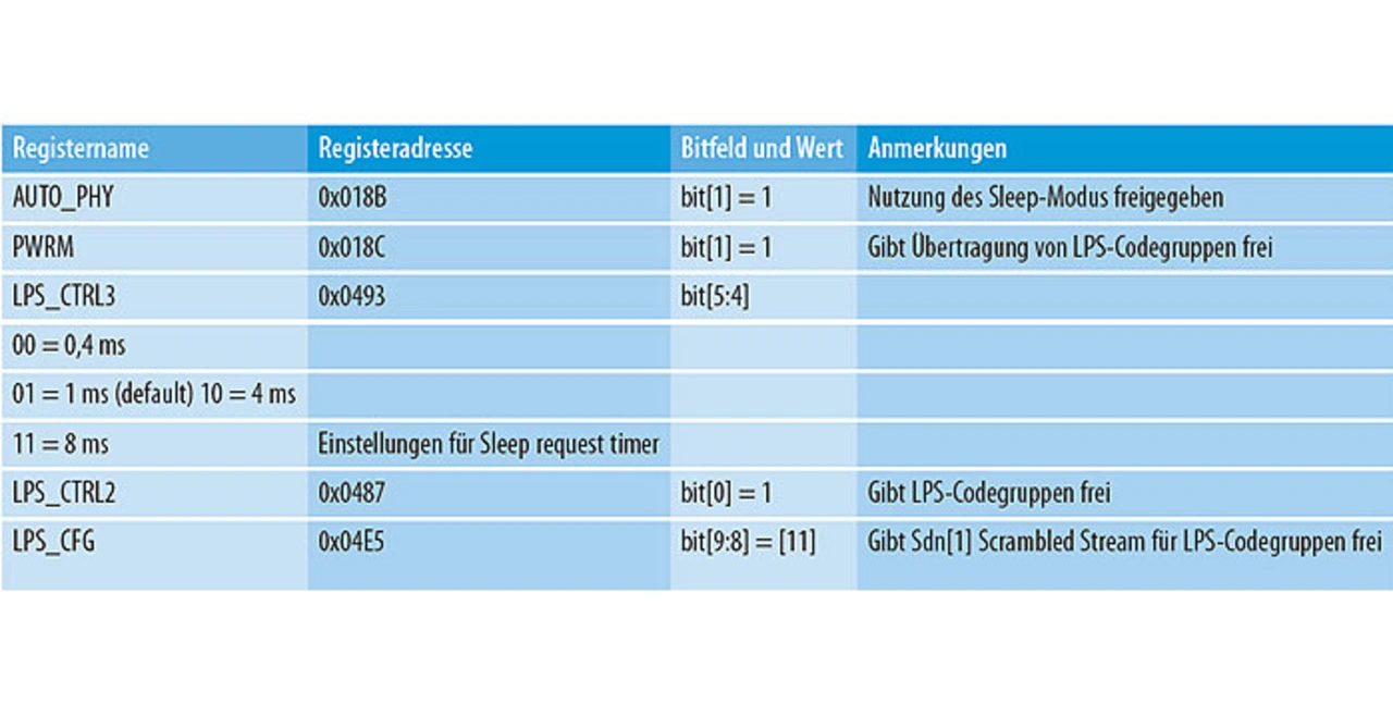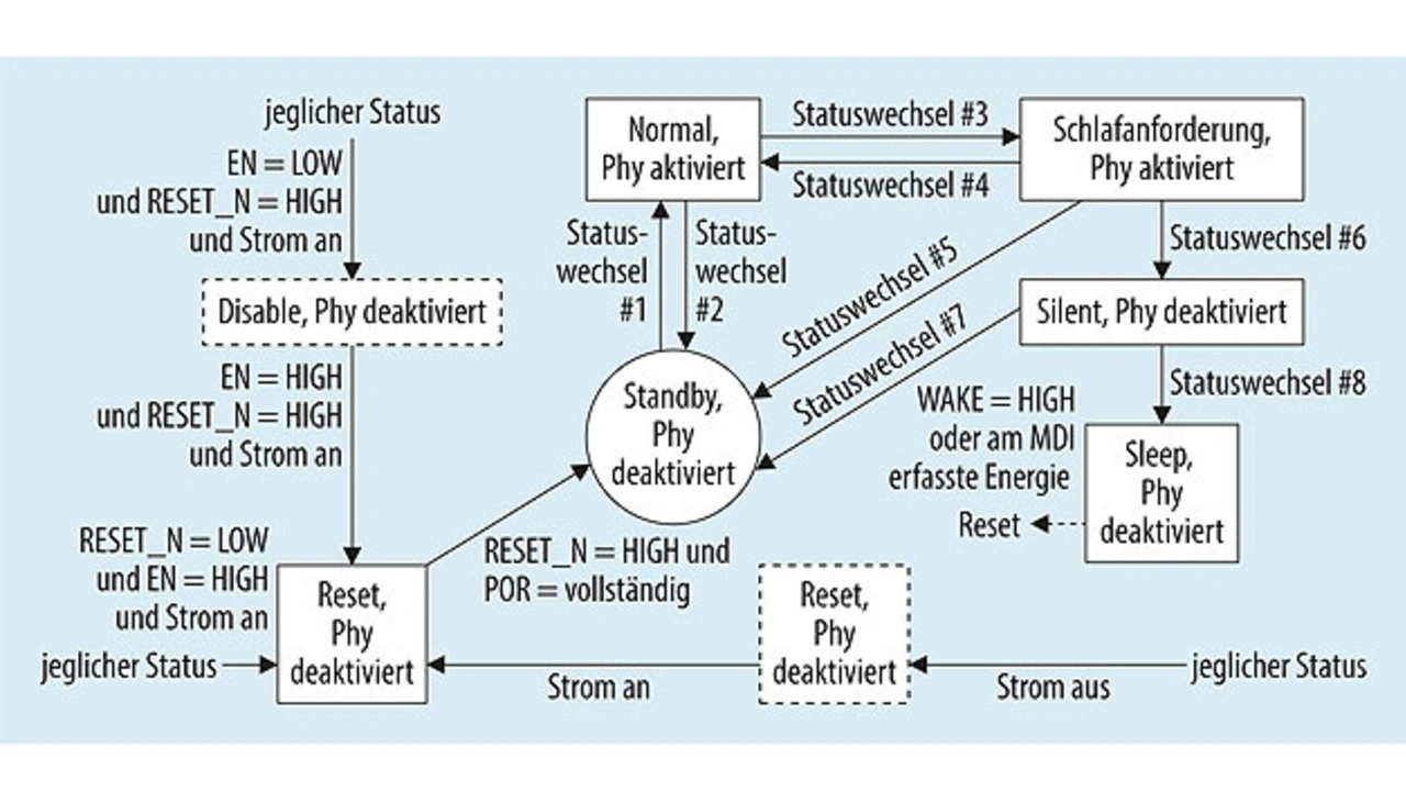 Automotive Ethernet ist ein relativ neuer Zweig im Rahmen des Ethernet-Standards, dessen Fokus in der Fahrzeugvernetzung, der Minimierung der Störabstrahlung – d. h. des hohen Störaufkommens von Multi-Twisted-Pair-Ethernet wie etwa 10BASE-T, 100BASE-TX und 1000BASE-T – sowie der Senkung des Fahrzeuggewichts durch Unterstützung des Vollduplexbetriebs über UTP-Kabel ist. IEEE802.3bw definiert diese neue Automotive-Spezifikation zur Erfüllung aller drei kritischen Vorgaben. Als weitere entscheidende Zielsetzung beim Einsatz von Ethernet in Automobil-Anwendungen kommt die Senkung des Stromverbrauchs hinzu. Eine Herausforderung bei den derzeitigen Ethernet-Lösungen ist die Notwendigkeit eines konstanten IDLE-Streams, um Punkt-zu-Punkt-Anwendungen beim Aufrechterhalten der Verbindung zu helfen, sowie sämtliche zugehörigen Unterprozesse für den Verbindungsaufbau. Weil MDIs stets aktiv sind, ist die Verlustleistung selbst bei einer Netzwerk-Auslastung von null größer als es in den meisten Automotive-Applikationen wünschenswert ist. Um in Zeiten, in denen die Auslastung gering und keine Datenübertragung erforderlich ist – also, wenn das Auto geparkt und die Zündung abgeschaltet ist – einen unnötigen Stromverbrauch zu vermeiden, wird die Low Power State Machine (LPSM) des DP83TC811 benutzt, um den PHY und die angeschlossenen Gegenstellen vom aktiven/normalen Betriebszustand durch eine Reihe von Zwischenschritten in einen stromsparenden Sleep-Status zu bringen.