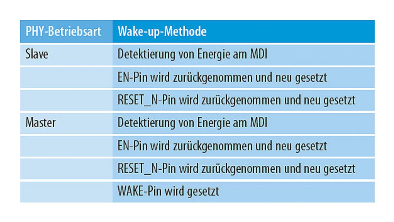 Der PHY verlässt den Sleep-Zustand und rekonfiguriert sich (POR), wenn eine der in Tabelle 3 aufgeführten Bedingungen erfüllt ist.