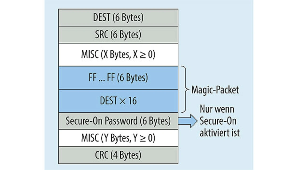 Ist er für die Magic-Packet-Detektierung konfiguriert, sucht der PHY alle an den Knoten adressierten Frames nach einer bestimmten Datensequenz ab, die den Frame als Magic-Packet-Frame kennzeichnen. Ein Magic-Packet-Frame muss außerdem abhängig von der gewählten LAN-Technik bestimmte Anforderungen erfüllen, wie etwa Source Address, Des-tination Address (dabei kann es sich um die IEEE-Adresse der empfangenden Station oder eine Broadcast Address handeln) und CRC.