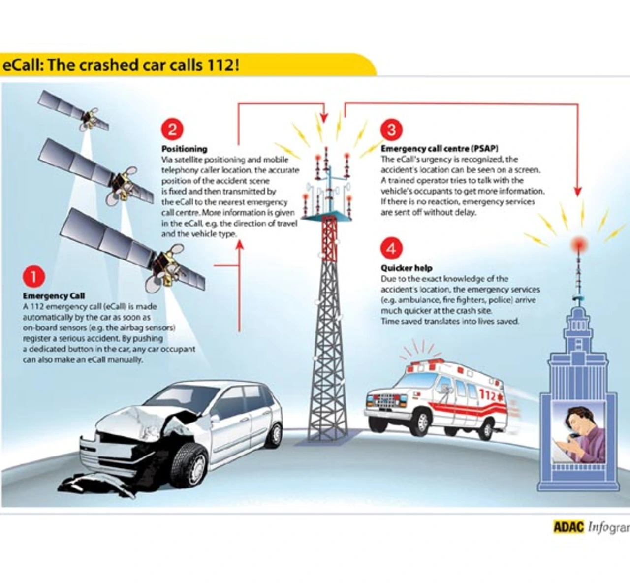 Das europäische eCall oder ähnliche Initiativen, wie OnStar in Nordamerika sowie bCall (breakdown call – zu Deutsch Pannenhilferuf), sollen in den nächsten Jahren vielerorts eingeführt damit. Ziel ist es, die Zahl der Verkehrstoten zu senken und die Schwere der Unfallfolgen zu minimieren. Von der Funktionsweise her sind diese Systeme ähnlich aufgebaut: Bei eCall verfügt ein Modul im Fahrzeug über die Fähigkeiten zur Mobilfunk-Kommunikation und zur GPS-Ortung. Wenn im Fahrzeug vorhandene Sensoren, beispielsweise Airbag-Sensoren, registrieren, dass das Fahrzeug an einer Kollision beteiligt ist, lösen sie einen Anruf des Moduls über die Notrufnummer 112 bei der Notrufzentrale aus (Bild 1).