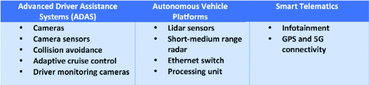 Der erste Trend, die Elektrifizierung, wird durch die Einführung von Hybrid- und Elektrofahrzeugen (EV) vorangetrieben. Es wird allgemein erwartet, dass die Akzeptanz in den nächsten Jahren für diese Fahrzeuge steigen wird, da die Branche die Batteriekosten weiter senkt, die Ladefähigkeit verbessert und die Reichweite von Elektrofahrzeugen erweitert. Die Autos werden auch „intelligenter“. Mit Sensoren und intelligenten Systemen ermöglichen sie den zweiten Trend, das autonome Fahren. In den letzten Jahren haben sich Systeme zur Kollisionsvermeidung und Notbremsung, automatisches Einparken, Spurwechselsensoren und andere Fahrassistenztechnologien in Fahrzeugen der Oberklasse zur Standardausstattung entwickelt. Mittlerweile gehen diese Funktionen nach und nach auch auf Mittelklassefahrzeuge über.