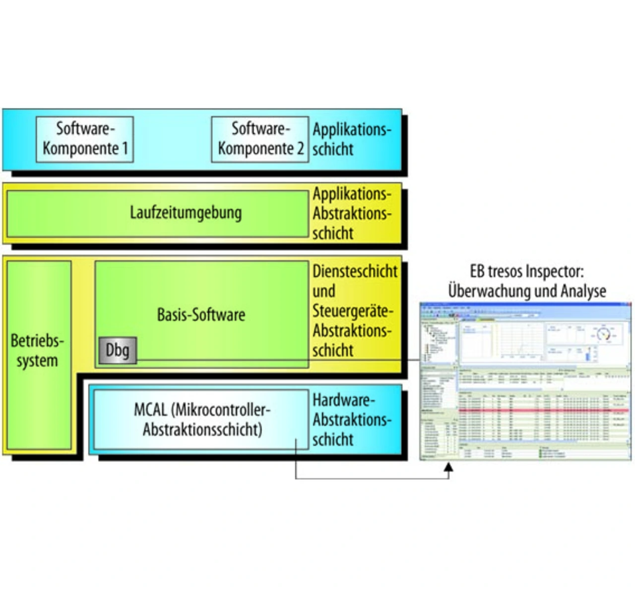 Mit EB tresos Inspector können die vom Dbg-Modul gemessenen Daten grafisch dargestellt werden. Die zur Laufzeit gelesenen Daten werden in eine leicht verständliche Abstraktionsebene gebracht und können dadurch einfach mit den Design- und Konfigurationsdaten verglichen werden. Sie können beispielsweise als Liste mit Zeitstempel, Name und Wert dargestellt werden. Zusätzliche Angaben, wie Informationen darüber, welche Funktion den Aufruf ausgelöst hat, sind ebenfalls einsehbar. Wird der AUTOSAR-Stack später auf dem realen Steuergerät betrieben, kann mit dem gleichen Werkzeug auch das Echtzeit-Verhalten des Codes überprüft werden. Die RTE-Signale können aber auch zusammen mit Bus-Signalen in einem y-t-Oszilloskop angezeigt werden. In dieser Darstellung lässt sich leicht die Laufzeit von Signalen durch den AUTOSAR-Stack bestimmen.
