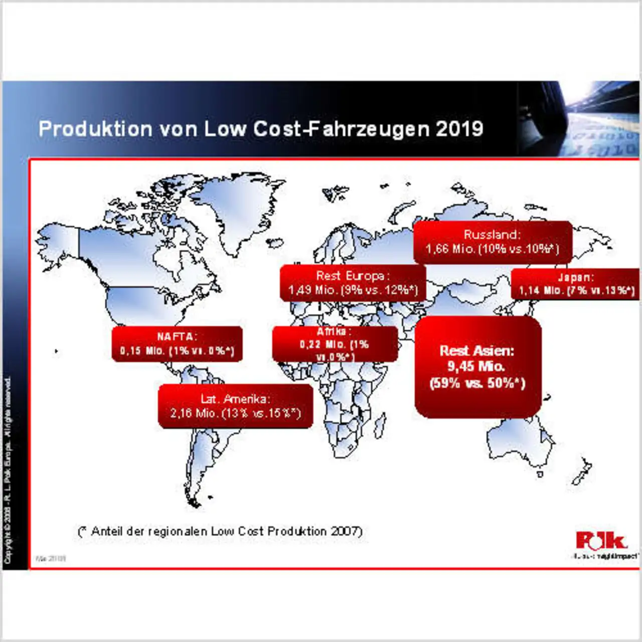 In den gesättigten Triademärkten diagnostizieren die Marktforscher nur ein begrenztes Low-Cost-Potenzial. Faktoren wie strenge Emissions- und Sicherheitsstandards, ausgeprägte Gebrauchtwagenmärkte und hohe Kundenanforderungen verhindern laut Polk einen Low-Cost-Boom.